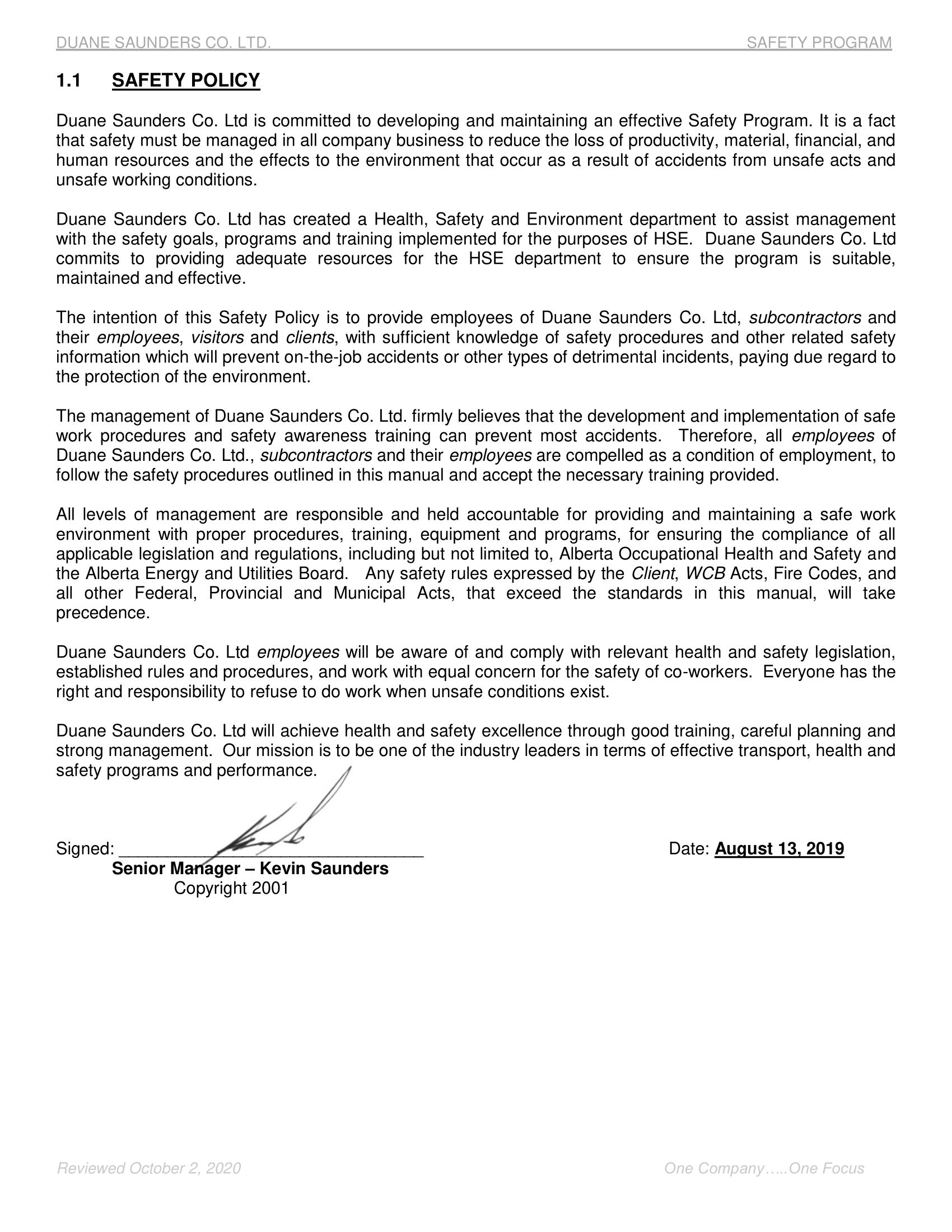 Below you will find our table of contents to our safety manual, Our Commitment to Safety policy and safety fitness certificate.